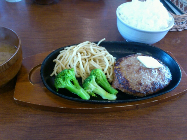 上に薄切りバターが乗ったハンバーグにライス、味噌汁が付いて800円。ゴハンは1.5倍で50円増し。2倍で100円増しだ。
