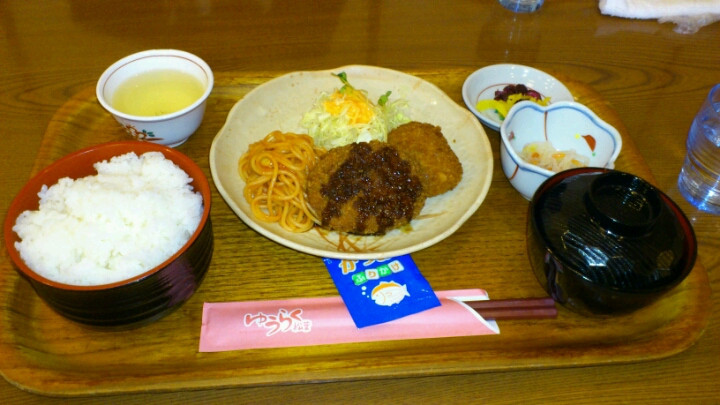 メンチカツ、カニクリームコロッケ、スパゲティがメインのおかず。