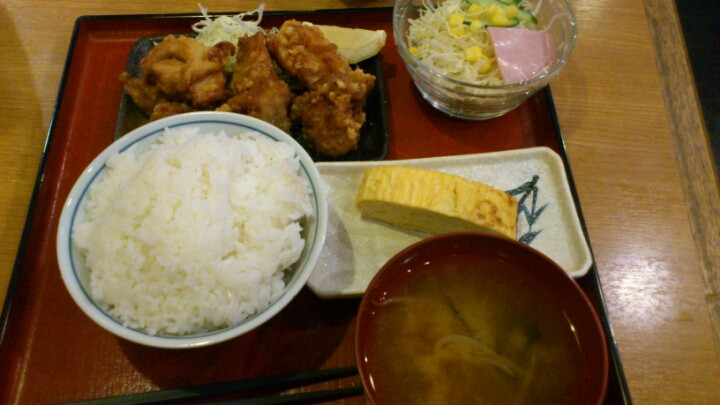 大きいおかずに魚関係を頼みたいところ、産地がわからないため鳥からあげを選択。
