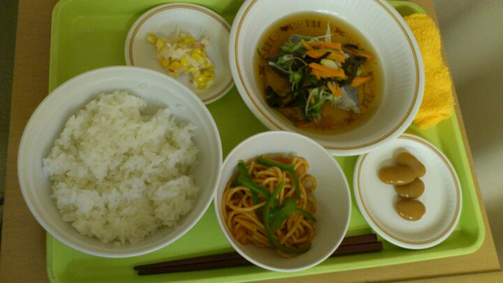 スパゲティ。コンビニ弁当で刻みキャベツの下敷きになっているような感じの全くコシのない麺。贅沢言わない。うまい。