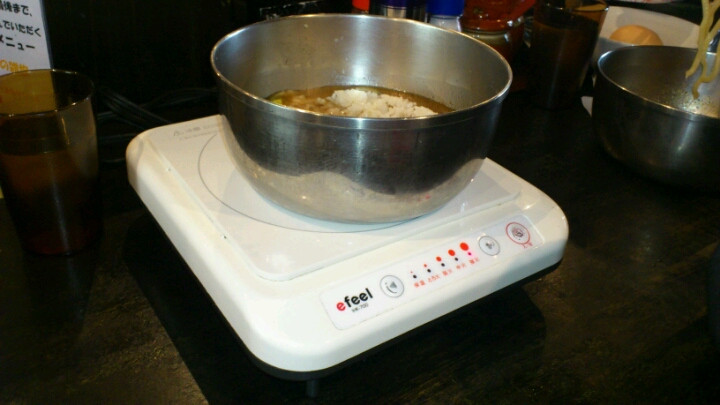 なんとライスと卵が無料となっており、麺を食べ終えてから卓上のIH機器でリゾットを作って食べると言うのがこの店流。