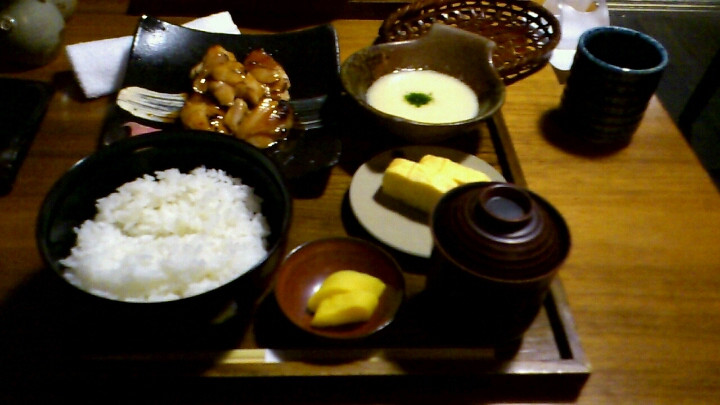 鳥の照り焼き、卵焼き、トロロ、味噌汁、たくあん次。