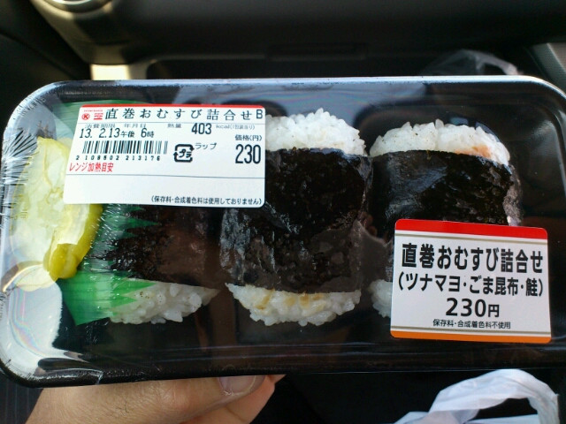 いつもなら駐車場で急いで食べることにしてだいすきなカップラーメンなんかを購入したりするのだが(10分もしないうちに食べ終わらせている)、今日は少しも時間がとれず購入後すぐに車で移動する必要があった。そのため車内でも苦労なく食べられるサンドイッチとおにぎりを購入いたしました。