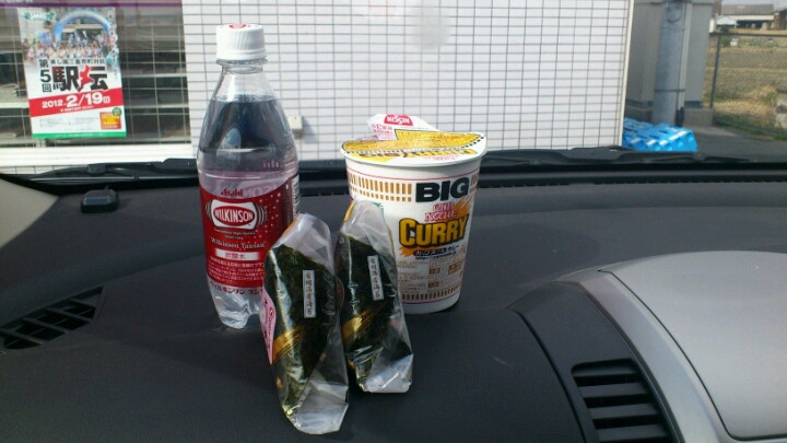 助手席でラーメンをすすりながら移動。